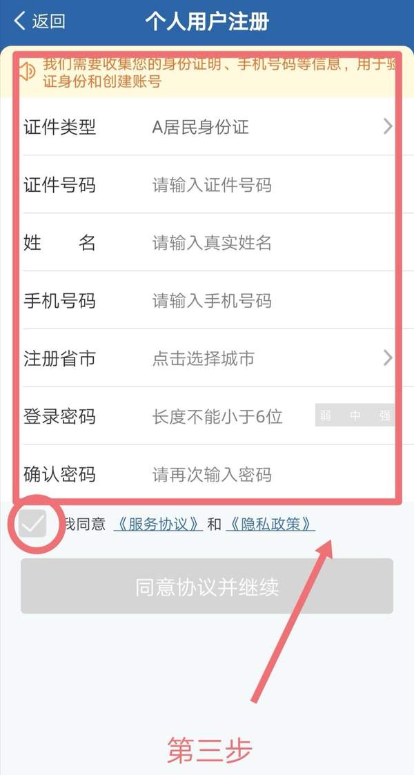 第三步:在注册页面中输入所需要的相关信息,勾选我同意《服务协议》和《隐私政策》同意协议并继续,完成手机实名认证,输入手机短信验证码,点击完成即可注册成功。
