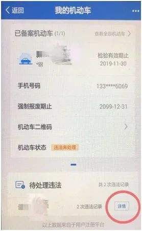 第五步:待处理违法,点击详情,在下面有选中其中一个违章并点击右下角,点击缴纳罚款后会提醒我们电子监控违法处理业务的规则,点击。