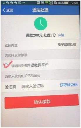 第六步:进入违法处理界面,勾选缴费平台,获取并填写手机验证码,点击【确认缴款】;