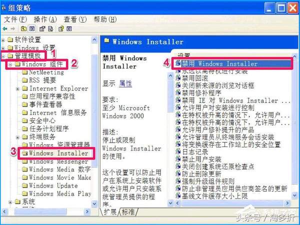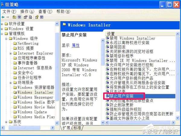5、设置好帐户后,还可以对其设置程序安装权限,方法,打开组策略,依次打开计算机配置->管理模板->Windows组件->Windows Installer,选定Winodws Installer项,在右侧选择“禁用Windows Installer”,以及“禁止用户安装”这一项,双击打开,设置其属性为“已启用”即可,具体方法上面以讲过。