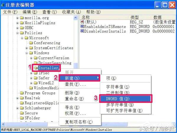 2、进入注册表编辑器后,按HKEY_LOCAL_MACHINE\SOFTWARE\Policies\Microsoft\Windows\Installer此路径定位于Installer上,然后右键->新建->DWORD值。
