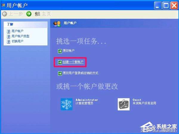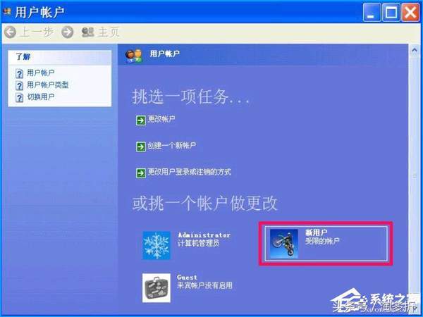 3、返回后,然后再“创建一个新帐户”,给新用户起个名,如“新用户”,按“下一步”。