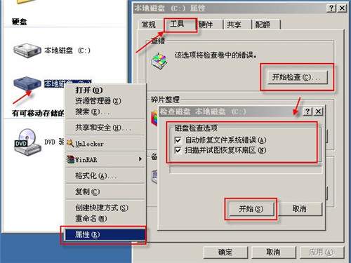 我们可以将电脑屏幕中的我的电脑打开,然后鼠标右击SD卡所在磁盘,在出现的页面中选择属性选项,接下来点击属性页面中的选择工具按钮,点击其中的开始检查选项,在弹出的对话框中,将两个选项都选中后,点击开始按钮。等到磁盘修复完成之后,还需要对它进行格式化处理。我们鼠标右击其所在的磁盘,选择页面中的格式化选项,在格式化页面中点击开始。如下图所示: