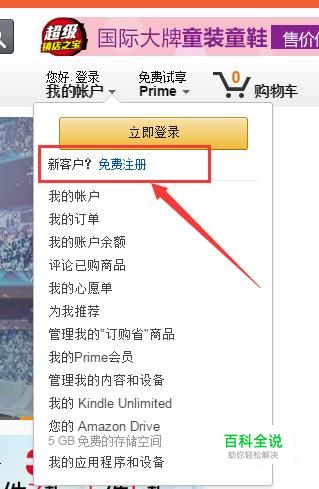 打开浏览器,在地址栏输入http://www.amazon.cn/,进入亚马逊官网,点击右上角我的账户,可以看到“立即登录”,下面是“免费注册”,点击免费注册。