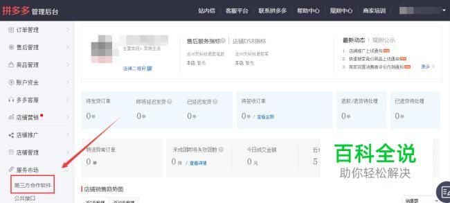 登录拼多多管理后台,左侧边栏选择“服务市场”→“第三方合作软件”。