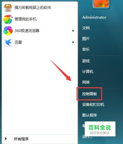 找到开始,点击开始在其内找到控制面板选项,如图所示: