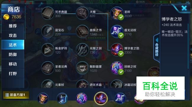 最后一件装备选择出博学者之怒。法术伤害可以加240。而且还有一个被动技能:毁灭 可以增加额外35%的法术伤害。也就是说所有的装备加起来伤害和的35%的伤害。这个装备相比较的话比贤者之书更加实用更加强大。