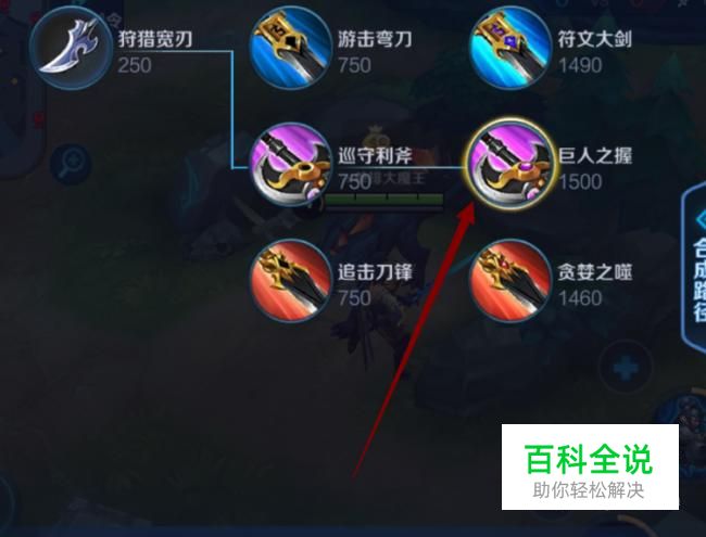 如果对线的话宫本只能骚扰一加二技能一般情况下秒不了人。所以可以选择打野出装套路。第一件装备先购买“巨人之握”打野专用装备。
