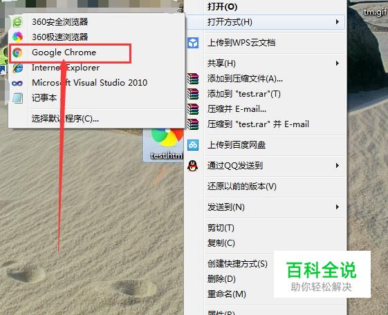 停留之后,还会出现一系列的选择菜单,我们选择用浏览器打开,在这里小编建议使用chrome浏览器打开,因为兼容性比较好。如果没安装有,也可以选择电脑自带的IE浏览器哦。