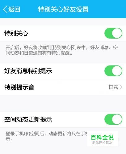 这时将特别关心后面的开关打开就可以了,打开之后我们还可以看见下方的其它提示,如果觉得动态更新或者消息更新的提示太频繁的话可以关掉它们。