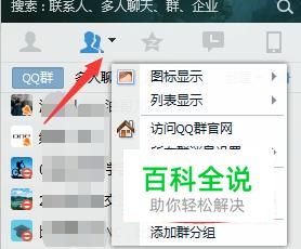 将鼠标指针移到该图标的右侧,点击那个小三角形,展开可以得到如图所示的菜单,选择“创建一个群”。