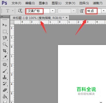 选择文字工具在上面的属性里设置字体大小和字体,如图所示: