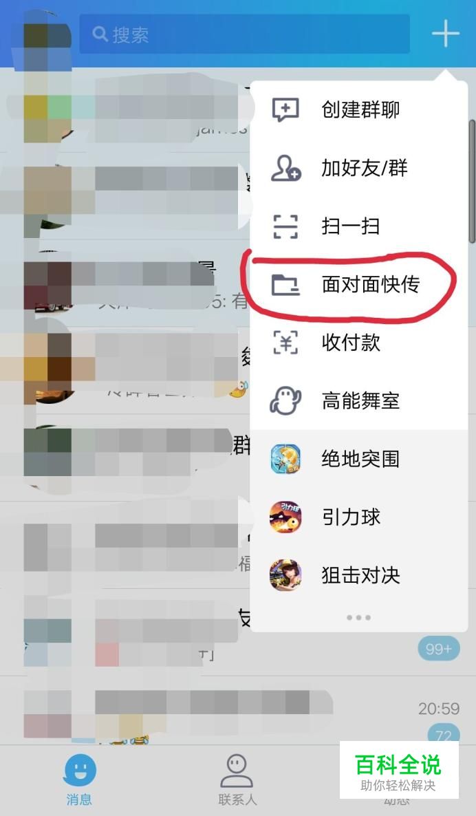 打开手机QQ,点击软件首页右上角的“+”,然后点击面对面快传,如下图。