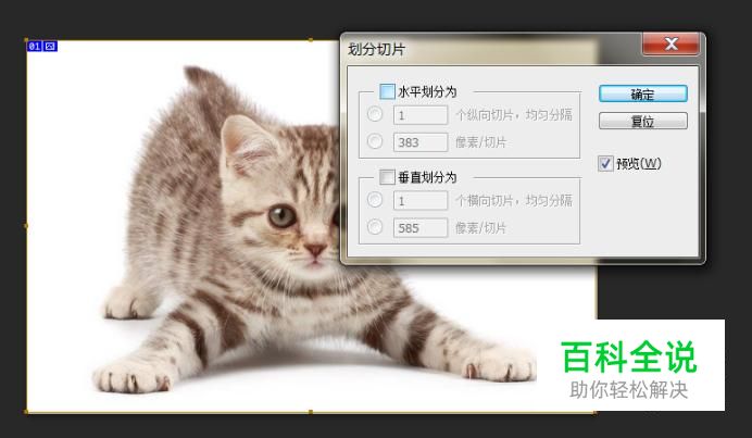 然后选择”水平划分“,或者”垂直划分“,勾选旁边的”预览“,就可以看到图片上是怎样切割的。