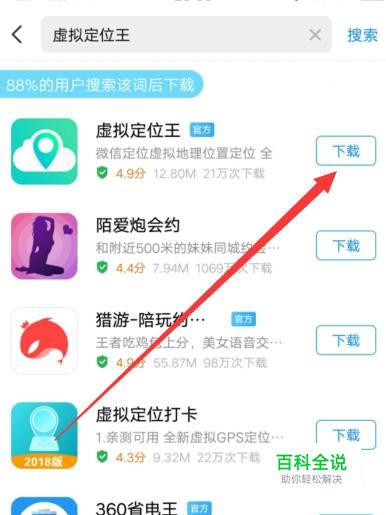 进入之后,搜索“虚拟定位王”,将其下载安装到手机上面,如图所示。