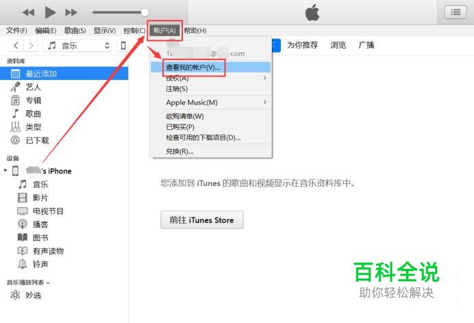 把手机连接到电脑上面,打开iTunes,点击“账户”下拉列表中的“查看我的账户”。