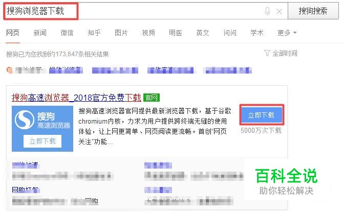 之后我们输入一个软件进行下载,我们输入搜狗浏览器下载,然后按回车键,弹出的界面,我们点击立即下载;
