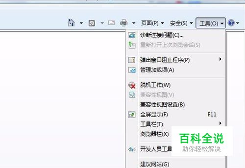 然后我们可以点击IE浏览器右上角的“工具”按钮,弹出菜单后选择“Internet”选项。