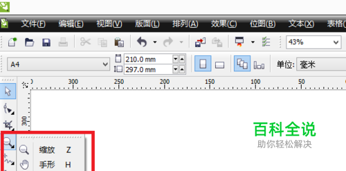 认识缩放、手形工具的位置及快捷方式 (1)位置:缩放和手形工具位于Coreldraw左侧工具栏的第四个,系统默认的是一个放大镜的图标。 用鼠标左键单击放大镜图标右下方的倒三角图标,其下属的两个工具--“缩放”、“手形”工具就会显示出来。再进行单击相应的图标就能使用了。 (2)快捷键:缩放工具的快捷键是“Z”。手形工具的快捷键是“H”。也就是可以直接通过键盘上面的这两个字母按钮来使用这两个工具,而不需要使用鼠标来单击选择。