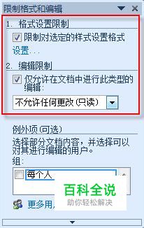 在随即打开的“限制格式和编辑”任务窗格中,选中“限制对选定的样式设置格式”和“仅允许在文档中进行此类型的编辑”复选框。