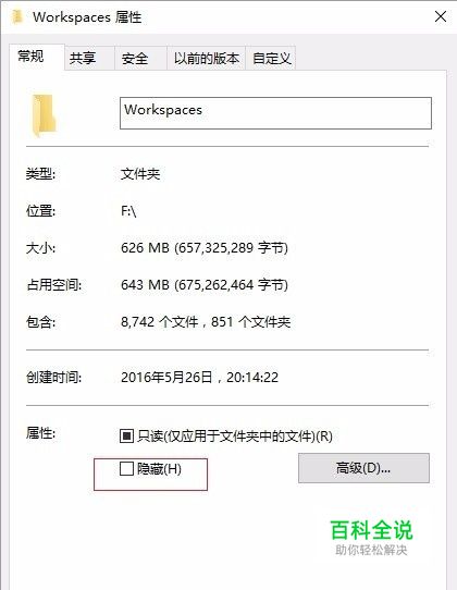 属性面板中勾选“隐藏”然后保存,此时该文件夹已经处于隐藏状态。