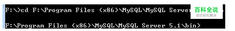 2,在CMD命令行窗口,进入MYSQL安装目录 比如 F:\Program Files (x86)\MySQL\MySQL Server 5.1\bin