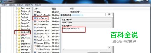 找到注册表路径HKEY_LOCAL_MACHINE\System\CurrentControlSet\Control\Session Manager\BootExecute,如果自启动,BootExecute里面的默认数值为“autocheck autochk *”