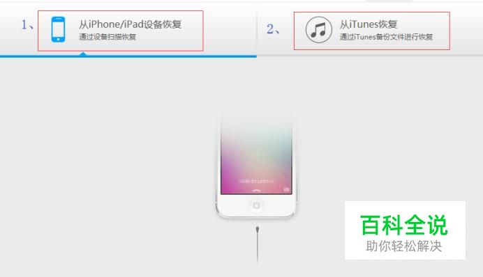 运行已经安装好的软件(此处选择的是PC端的万能苹果恢复大师软件),在界面上可以看到有两种恢复模式:1.从iPhone设备扫描恢复、2.从iTunes备份恢复。选择其中的一个进行恢复即可,我们选择从iPhone设备扫描恢复演示步骤。