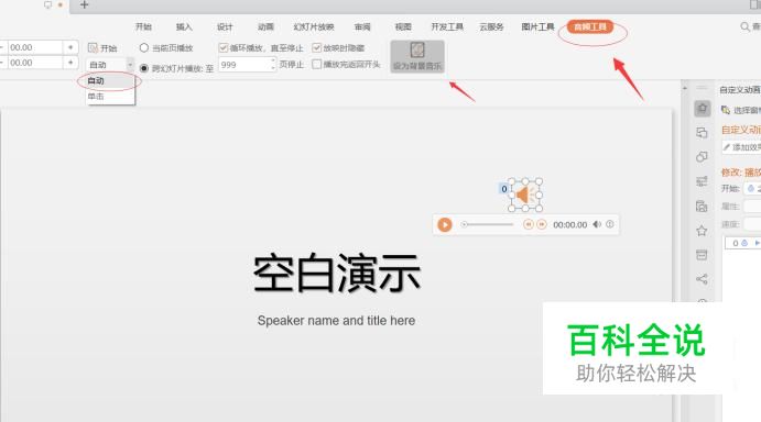 在工具栏中切换到音频工具,点击设置为背景音乐,设置播放模式为自动,如下图,这样在放映的时候,设置好的背景音乐就会自动播放了