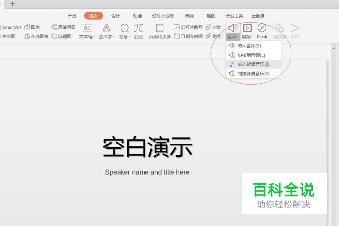 选中工具栏中的插入,选择其中的嵌入背景音乐