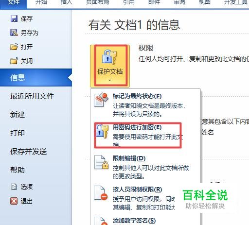 之后我们点击保护文档,弹出的界面,我们点击用密码进行加密;
