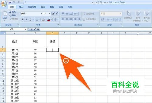 为了示范怎样让Excel多条件自动判断,现打开一个表格,在此表格中:要让分数大于90的显示为“特优”,分数大于80的显示“优秀”,分数大于70的显示"良好",分数大于60的显示“及格”,分数小于60的显示“不及格”。双击要显示评级的第一个单元格,如箭头1所指