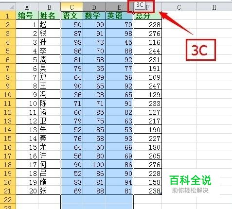 此时把鼠标 按住不放,拖到E列,右上角出现 3C, 此时表明C:E三列已被选中,如下图所示 注:3C即 3Columns ,就是选中了三列的意思