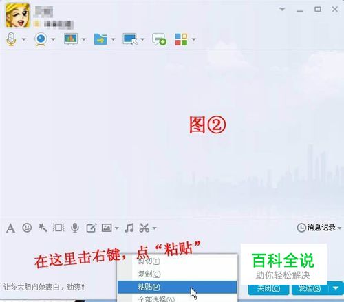 2.登录你的QQ,在QQ面板上双击你要传送给文件的那个好友的头像,就会出现聊天窗口。然后在这个聊天窗口下部的消息发送框内点鼠标右键,再点“粘贴”。