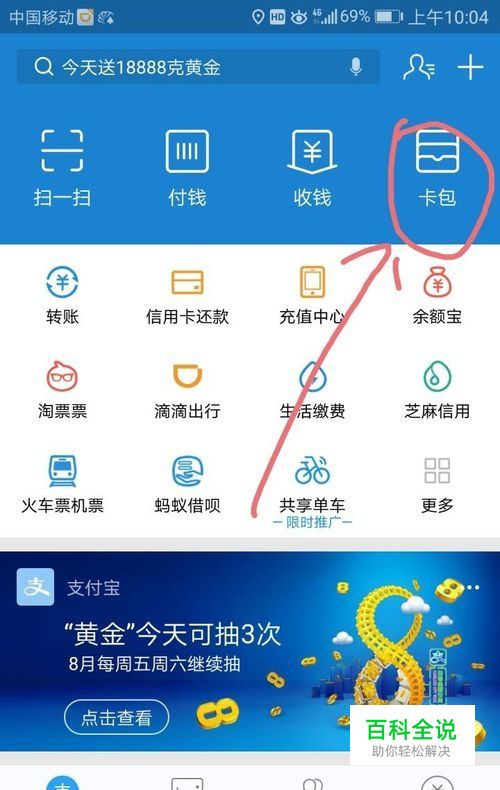 进入支付宝app应用后点按,在首页中点按右上角的卡包标志,进入卡包。