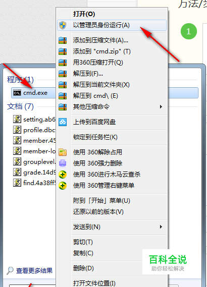 以管理员方式启动“CMD” 开始---->cmd---->右键---->以管理员身份运行