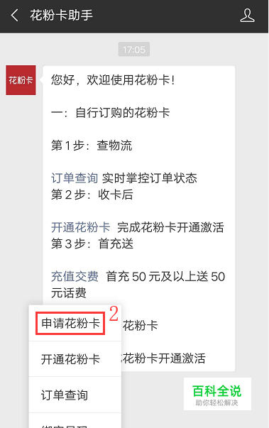 方法二: 可以在官方微信公众号“花粉卡助手”上点击【开通】-【申请花粉卡】申请“订购花粉卡”;