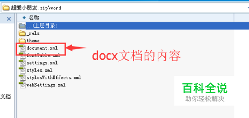 用压缩软件打开改好之后的文档,打开“word”文件夹,查看“document.xml”,这个就是docx文档的内容。