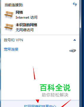 首先单击如下图网络图标,在单击打开网络和共享中心。