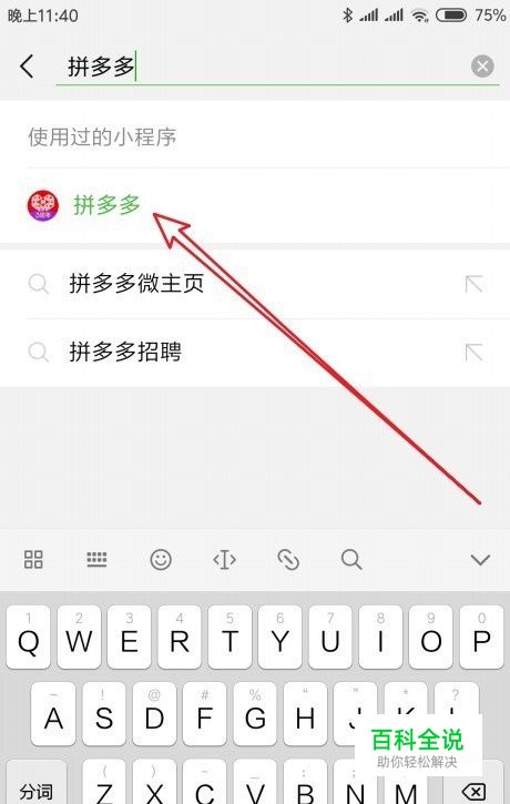 在弹出的搜索框中输入“拼多多”进行搜索,然后点击下面的搜索结果中的“拼多多”快捷链接,这样也可以打开拼多多的页面。
