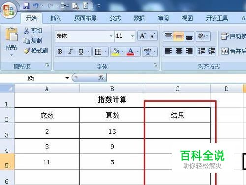 为了计算指数,我们需要自己制作一个辅助计算的表格,我们将指数的底数和幂数分别放到两列当中,幂值结果单独放到一列。
