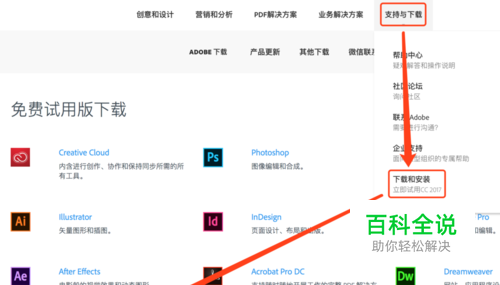 进入Adobe官方网站,找到下载与支持,选择下载与安装,再选择XD安装。