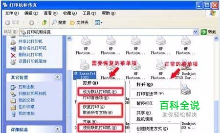 恢复打印状态 打印机处于“脱机”、“暂停”状态会导致打印机无法正常打印。 依次点击“开始”→“打印机和传真”。在“打印机和传真”窗口中,找到打印机的图标。 没有正确卸载就再次安装驱动程序,可能会导致“打印机和传真”窗口中出现名称为“副本”的打印机图标。需要按照下列步骤将同型号的“副本”打印机设置为正确的状态后才能打印。 在“打印机和传真”窗口中,右键点击您使用的打印机图标,如果出现“设为默认打印机”、“使用联机打印机”、“恢复打印”、“取消所有文档”菜单项,需要分别点击对应的菜单项恢复正常打印状态。如图 2 设置打印状态所示: “设为默认打印机”、“使用联机打印机”、“恢复打印”、“取消所有文档”四个菜单项不一定会一起出现,其中某个或者某几个菜单项出现,就需要点击对应的菜单项恢复正常打印状态。 点击“设为默认打印机”菜单项后,打印机图标会出现勾选标记()。 点击“恢复打印”、“使用联机打印机”菜单项后,打印机由“暂停 - 脱机”状态改为“准备就绪”状态。 点击“取消所有文档”菜单项后,会删除由于意外而中止打印的文档,“文档”改为“0”。 在“打印机和传真”窗口中,再次点击打印机图标,电脑会显示正确的打印状态。正确的打印状态:“文档”为“0”,“状态”为“准备就绪”。如图 3 打印状态所示: