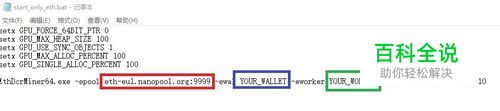 配置挖矿文件: 解压下载好的 Claymore's Dua Miner 右键编辑 start_only_eth.bat 文件(使用记事本打开 start_only_eth.bat) 将图中红色框中内容,修改为矿池地址 将图中蓝色框中内容,修改为钱包地址 将图中绿色框中内容,修改为你的矿工名(也可以不做修改) 修改完成后,保存并退出。