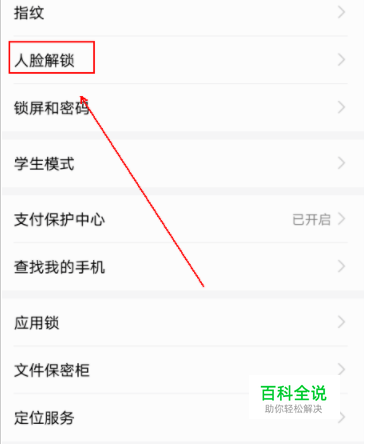 在“安全和隐私”菜单列表中单击“人脸解锁”选项,如下图所示:
