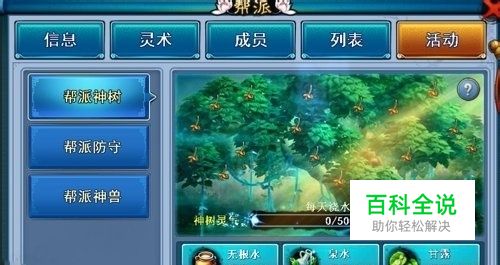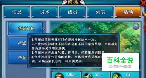 1. 创建帮派后,帮派成员每天都可以给帮派神树浇水一次。 2. 帮派成员给神树浇不同的水会有不同的帮贡奖励和帮派神树灵气值的提升,水质越好帮贡越多灵气增加越快。 3. 帮派神树产出真气果、道具果、经验果及铜钱果。 4. 每次神树灵气值满的时候,全体帮派成员都可以来采摘果实,采摘后随机获得一种果实奖励。