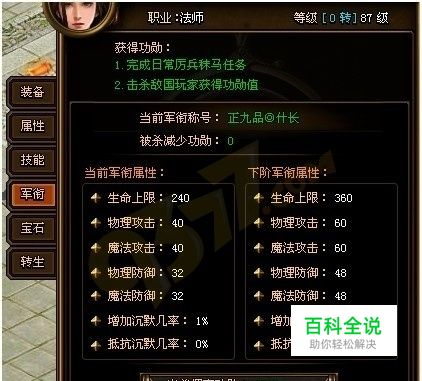 1、《魅影传说》军衔简介: 9377魅影传说军衔不仅能让角色显示称号,还能增加大量属性,其中还有只有特殊宝石才能增加的沉默属性,打开角色栏“军衔”可查看自己的官职级别。 《魅影传说》功勋值达到要求,军衔则会自动提升,军衔越高角色增加的属性越多。 2、《魅影传说》功勋获得途径: 《魅影传说》日常厉兵秣马(天机老人)任务可获得功勋。 击杀敌国玩家可获得功勋值(被敌国击杀也是会减少功勋值)。 《魅影传说》军衔称号会直接显示在人物名字上方。