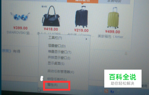 在任务栏上,右击鼠标,然后点击“属性”