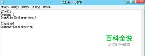 打开记事本,输入下面的内容, [Shell] Command=2 IconFile=explorer.exe,3 [Taskbar] Command=ToggleDesktop