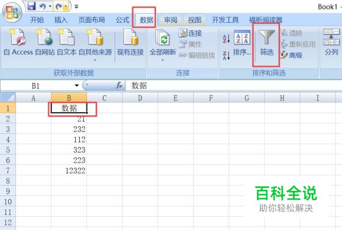 然后我们选中数据那个单元格,之后我们点击工具栏中的数据,之后点击筛选;